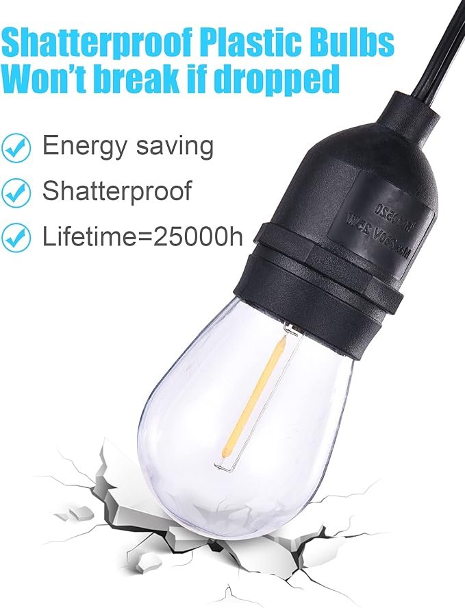 1. 52FT Outdoor LED String Lights Shatterproof UL Listed 2FT Spacing with 26 Plastic Bulbs, Commercial Grade Hanging Lights String 24 Sockets, Decorative Patio Lights for Backyard Garden