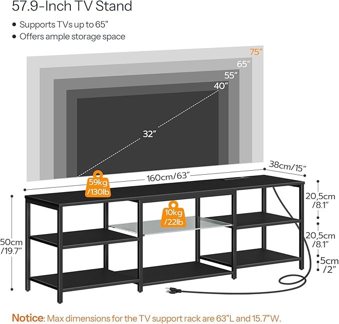 Elevate your entertainment space with the HOOBRO TV Stand with LED Lights, designed for up to 75-inch TVs and featuring a built-in power center in a sleek 63″ wide layout. With three open shelves for generous storage, plus integrated outlets and USB ports, it keeps large screens and accessories organized. The modern black finish, adjustable LED light strip, and sturdy construction make it perfect for living rooms or gaming setups—upgrade your media console today.