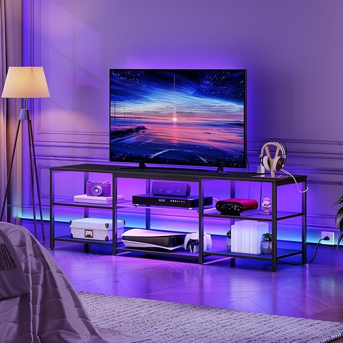 Upgrade your living space with the HOOBRO LED TV Stand for 75-inch TVs, designed with a built-in charging station, 3-tier open storage, and customizable LED lighting. Its sleek black finish and sturdy structure blend modern style with everyday functionality—perfect for entertainment, gaming, or relaxation. Bring organization and ambiance to your home—click to discover more.