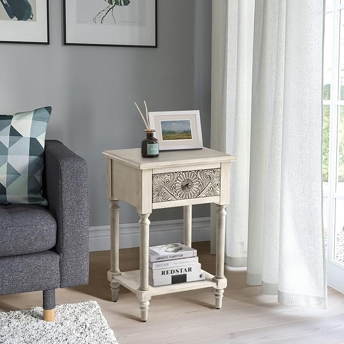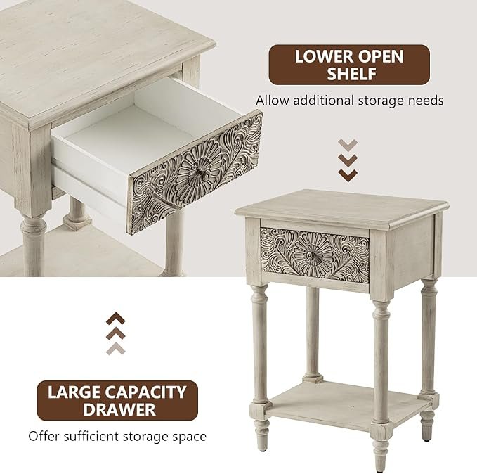 Enhance your bedroom or living room with the COSIEST Vintage Nightstand, a stylish and functional 2-tier bedside table. Crafted from durable MDF with wood accents, it features a smooth storage drawer for personal items and an open shelf for books, decor, or electronics. Its compact, space-saving design makes it ideal for any room, combining vintage charm with modern practicality. Upgrade your home organization and style effortlessly—click to explore this elegant nightstand today.