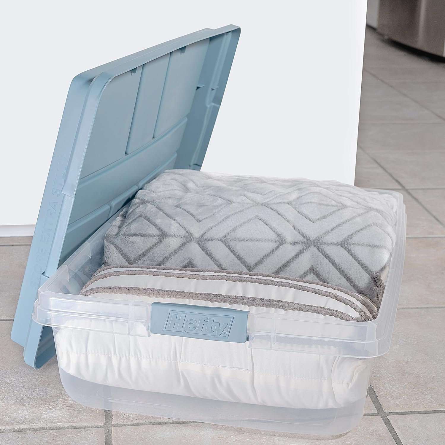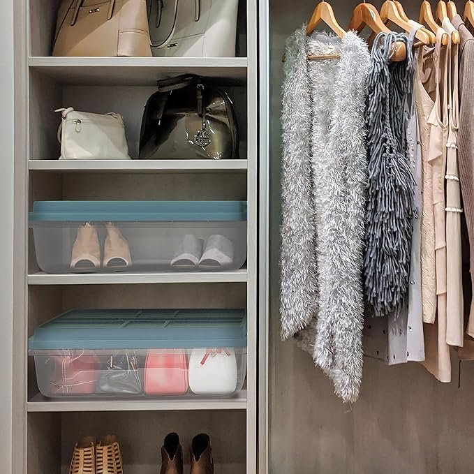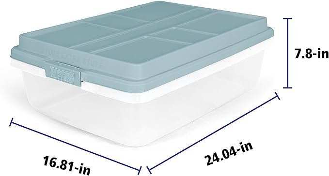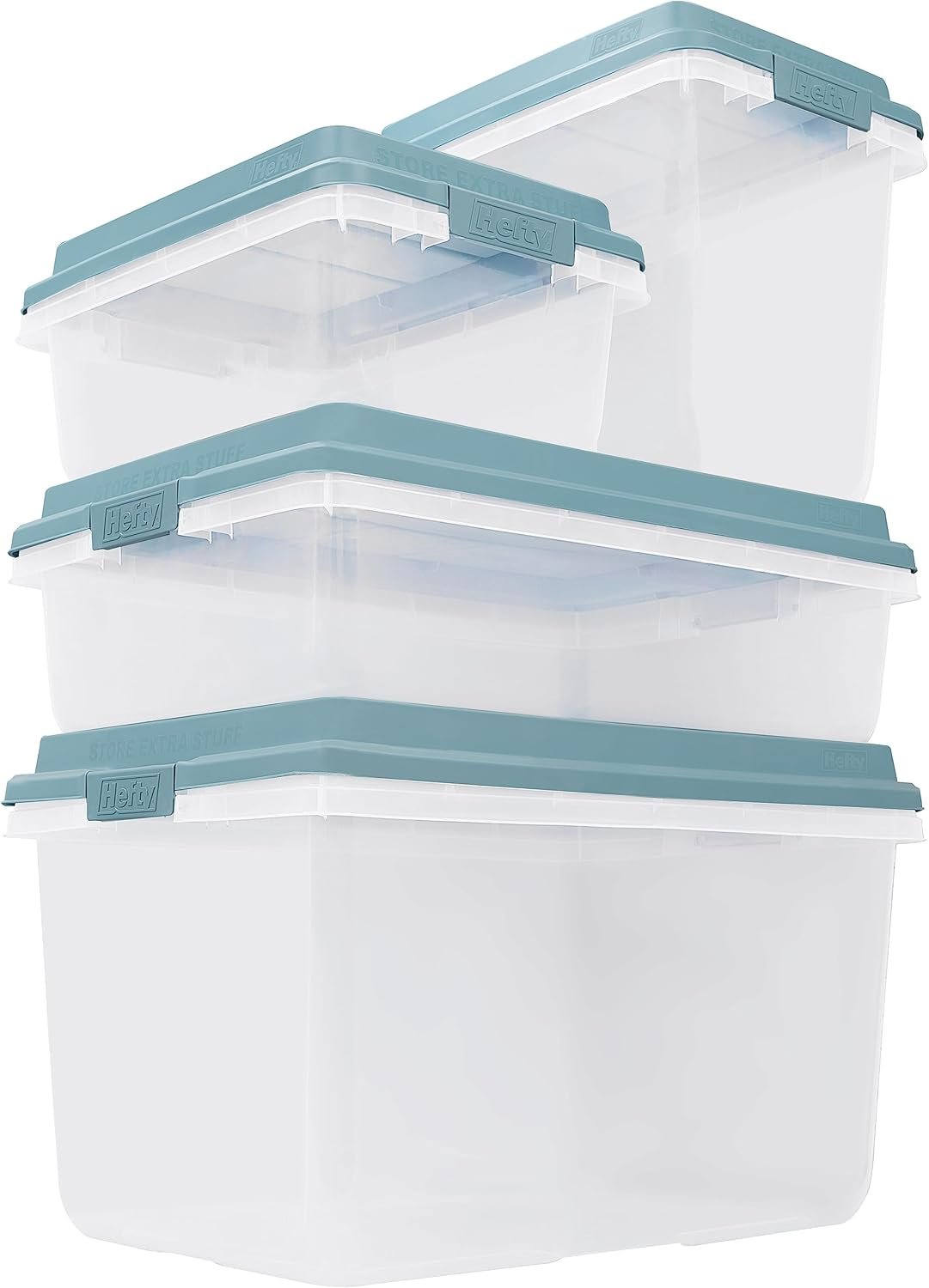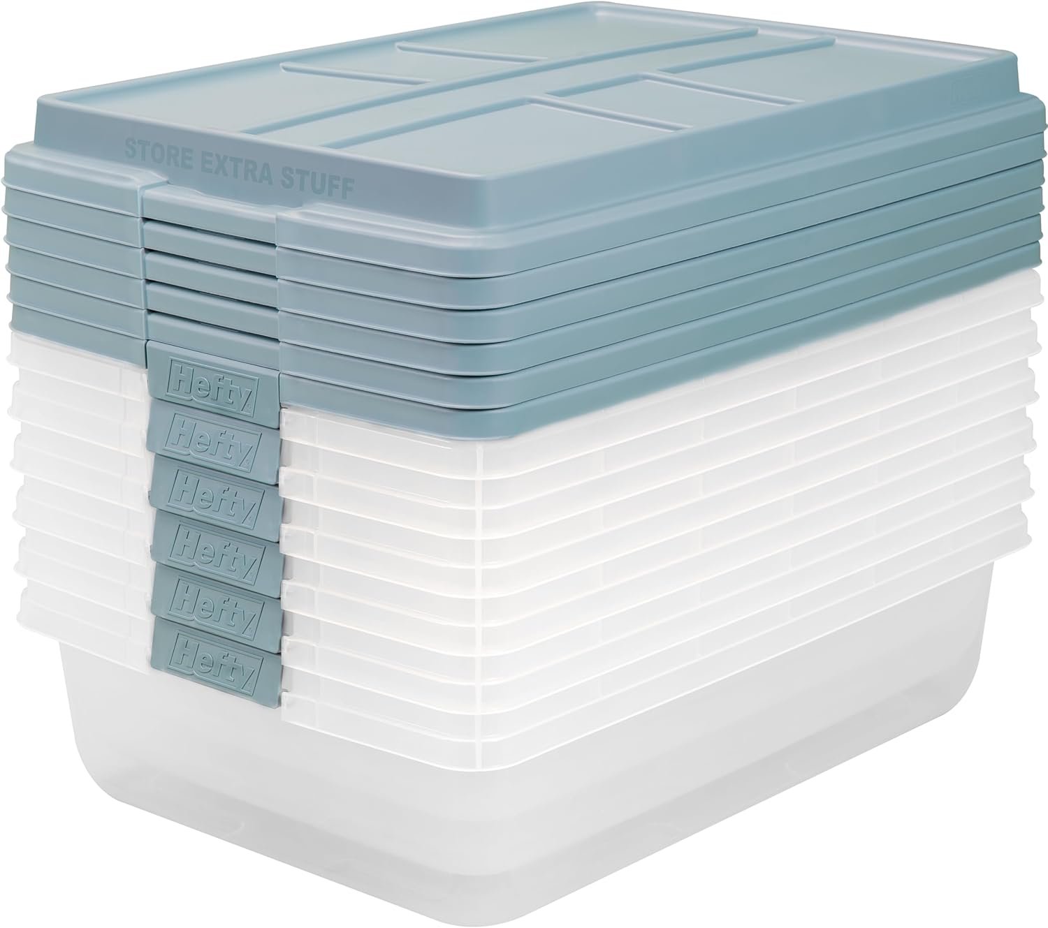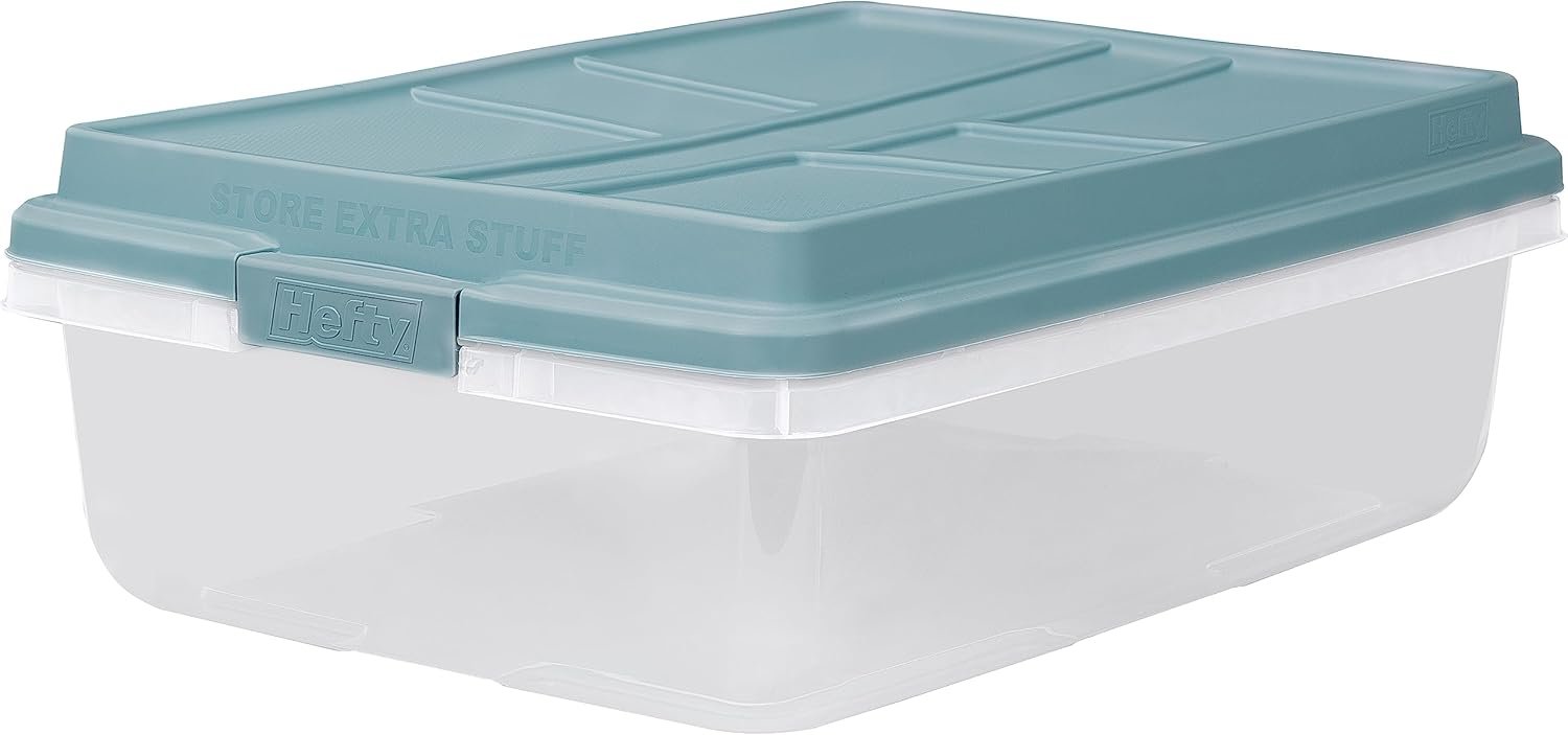 Keep your space tidy and organized with the Hefty HI-RISE 40 Qt Stackable Storage Bins. Designed for under-bed or closet storage, these clear plastic containers feature extra-large locking lids, comfort-grip handles, and a durable double-rim design for secure stacking. Perfect for shoes, clothes, or seasonal items, they offer easy visibility and access. Simplify your home organization today with this 6-pack of heavy-duty storage bins.