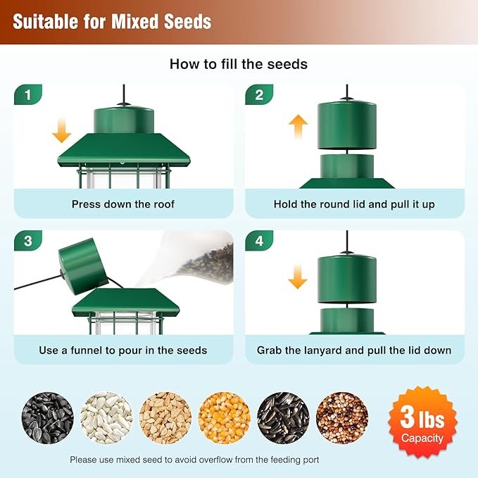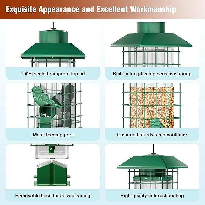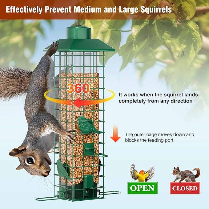 Keep your backyard birds happy while keeping squirrels out with the GAINSEN Squirrel Proof Metal Bird Feeder. Designed with a weight-activated mechanism, this durable tube feeder automatically closes access to seeds when squirrels try to feed, ensuring your feathered friends enjoy uninterrupted meals. With four feeding ports and a 3 lb capacity, it easily accommodates multiple birds at once, from cardinals and finches to bluebirds. Crafted from weather-resistant materials, it withstands all seasons while maintaining a clean, attractive design for any outdoor space. Simple to hang and refill, this feeder makes bird-watching effortless and enjoyable. Upgrade your garden feeding station today and create a safe, squirrel-free haven for your favorite wild birds.