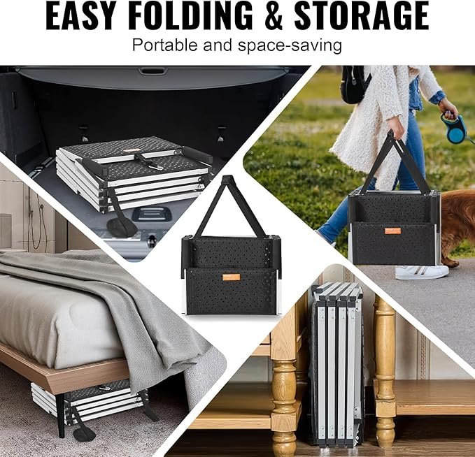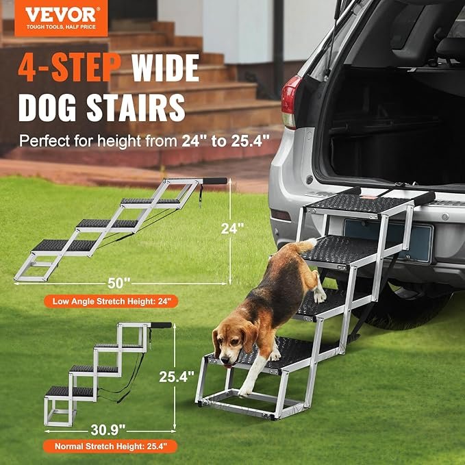 Make car travel safer and more comfortable for your pets with the VEVOR 4-Step Folding Dog Car Ramp. Crafted from lightweight yet durable aluminum, it supports pets up to 250 lbs, making it ideal for small, medium, and large dogs. The nonslip steps provide secure footing, ensuring safe and stable access for elderly pets or those with joint issues. Its foldable, portable design allows easy storage in your car trunk and quick setup wherever you go, while the adjustable height fits most cars, SUVs, and trucks. With sturdy construction and easy portability, it offers convenience, safety, and comfort for your furry companions.